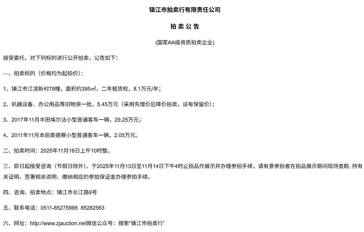 鎮江市拍賣行有限責任公司拍 租 公 吿(國家AA級資質拍賣企業)接受委托,對下列標的進行公開拍租(三拍),公告如下:—、拍租標的(以下價格均為半年至3年租賃權起拍價):1.  建行揚中豐裕支行營業網點二、三、四層經營用房(揚中市三茅鎮三豐南路5號),租賃面積約1080㎡,每層面積約360㎡,三拍底價11.98萬/年(0.3元/平方米/天)。2.  建行揚中油坊支行營業網點三、四層經營用房(揚中市油坊鎮太陽路129號),租賃面積約590㎡,每層面積約295㎡,三拍底價5.34萬/年(0.25元/平方米/天)。3. 建行揚中八橋支行營業網點三、四層經營用房(揚中市八橋鎮太平北路29號),租賃  面積約400㎡,三層約185㎡,四層約215㎡,三拍底價4.43萬/年(0.25元/平方米/天)。以上3套房產均可分層部分出租,拍租價=拍租面積*每平方米每天的租賃單價4. 建行鎮江團山路支行營業網點一層經營用房(鎮江市檀山路8號60幢102、103室),租賃面積約597.09㎡,三拍底價34.52萬/年。5. 建行丹陽原賢橋分理處營業用房(丹陽市城河路15-21號),租賃面積約93.88㎡,二拍底價7.16萬/年。二、拍租時間:2025年11月23日上午10時整。三、即日起接受咨詢(節假日除外)。于11月17日至11月21日下午4時止拍品作展示并辦理參拍手續,請有意參拍者在拍品展示期間現場查勘,持有關證明、簽署相關說明、繳納相應的參拍保證金辦理參拍手續。四、咨詢、拍租地點:鎮江市長江路9號五、聯系方式:0511-85275988   13655299933楊先生六、網址:http://www_zjauction_net.gzlzdz.com;微信公眾號:搜索“鎮江市拍賣行” 拍品清單2025.11.23序號名稱起拍價(元)標的說明1建行揚中豐裕支行營業網點二、三、四層經營用房(揚中市三茅鎮三豐南路5號),租賃面積約1080㎡,每層面積約360㎡三拍底價11.98萬/年(0.3元/平方米/天)1、1-3號房產均可分層部分出租,拍租價=拍租面積*每平方米每天的租賃單價;2、意向競拍人在拍賣前需持營業執照或身份證與委托方說明租賃房產經營業態,確定意向后出具房產承租用途承諾書,經委托方審核后,方可交納保證金參加競拍;3、租賃期限為半年至3年(承租方與出租方協商而定),承租方每半年或一年結付租金,租賃期間的水、電費用及其它相關費用均由承租方承擔;4、承租方不得用于經營和保管危險物品,不得用于開設餐飲、娛樂等可能嚴重影響消防安全、運營安全的經營業態,不得用于經營委托貸款、小額貸款等可能冒用委托方名義,帶來聲譽風險的經營業態。租賃期內,承租方不得破壞墻體結構,自行成就消防、安全等使用條件,不得擅自將租賃房屋轉租、轉讓給他人使用,否則委托方有權收回房屋;5、拍租成交后,承租方將租金交至出租方指定賬戶,傭金交至拍賣方賬戶(拍租傭金為該房屋一個月租金)。承租方憑租賃合同無息退還保證金。2建行揚中油坊支行營業網點三、四層經營用房(揚中市油坊鎮太陽路129號),租賃面積約590㎡,每層面積約295㎡三拍底價5.34萬/年(0.25元/平方米/天)3建行揚中八橋支行營業網點三、四層經營用房(揚中市八橋鎮太平北路29號),租賃面積約490㎡,每層面積約245㎡三拍底價4.43萬/年(0.25元/平方米/天)4建行鎮江團山路支行營業網點一層經營用房(鎮江市檀山路8號60幢102、103室),建筑面積約597.09㎡三拍底價34.52萬/年5建行丹陽原賢橋分理處營業用房(丹陽市城河路15-21號),建筑面積約93.88㎡二拍底價7.16萬/年